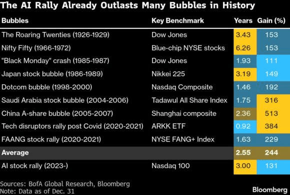The AI-driven rally has already persisted longer than many historical market bubbles when measured by duration alone. While analysts acknowledge similarities to prior episodes such as the dot-com era, there are also important differences.