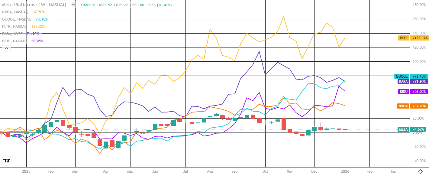 Recent stock performance illustrates this divergence. Several companies most closely associated with aggressive AI capital spending have faced pressure as investors reassess near-term returns. Meta Platforms shares have fallen more than 20% since its third-quarter update in late October, when management outlined substantial capital and expense commitments tied to its pursuit of “superintelligence.”