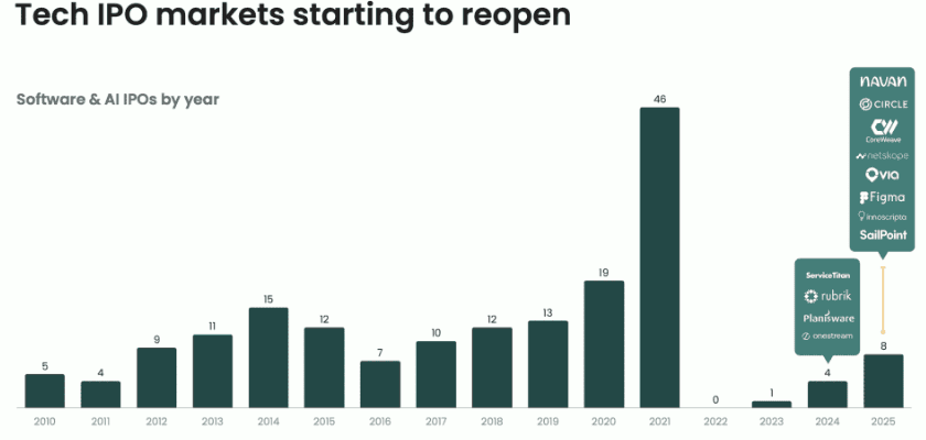 In just three years, 78 software and AI companies went public a truly unprecedented window for tech exits.
