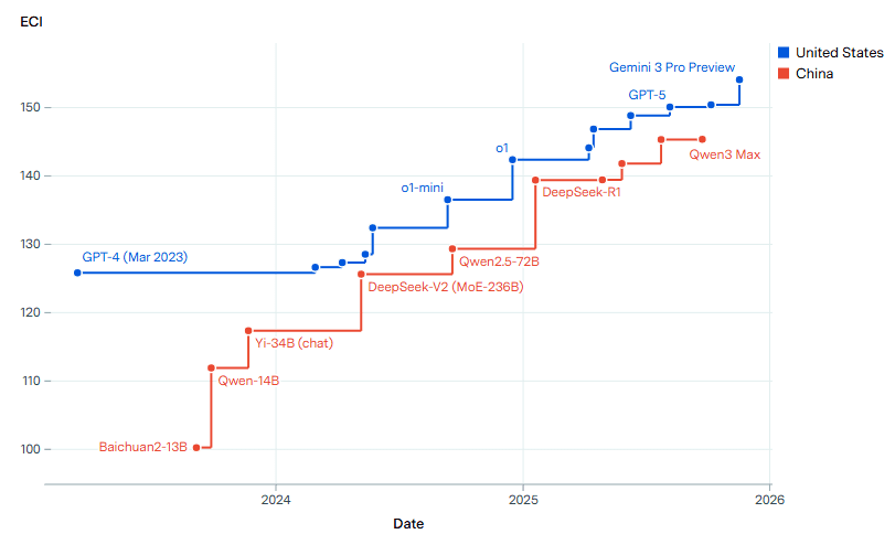 Since 2023, every AI model at the cutting edge measured by the Epoch Capabilities Index—has been developed in the United States.