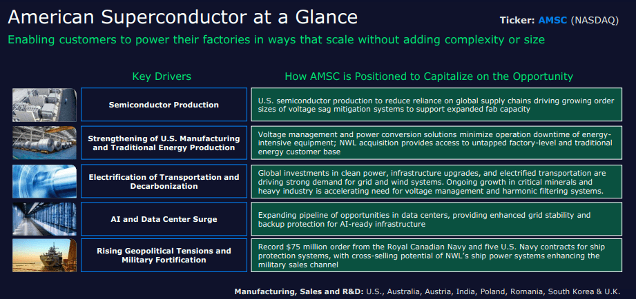 AMSC’s business sits at the intersection of power electronics, grid resiliency, and semiconductor supply-chain demand, with five key growth drivers: