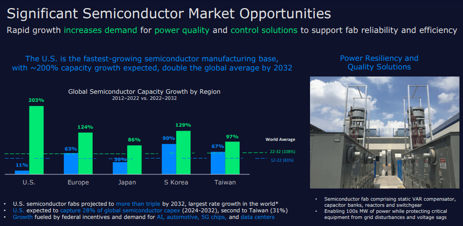 Reshoring & Fab Expansion: U.S.-based semiconductor production is surging, driving new orders for substation-level power conditioning.