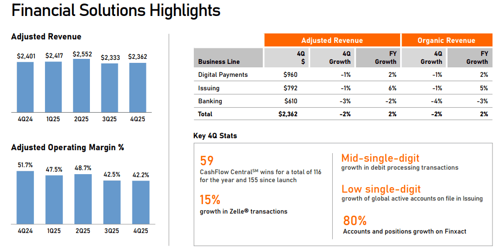 Banking services revenue declined 4% year over year, while Financial Solutions revenue fell 2%, reflecting slower organic growth and softer demand across parts of its core franchise.