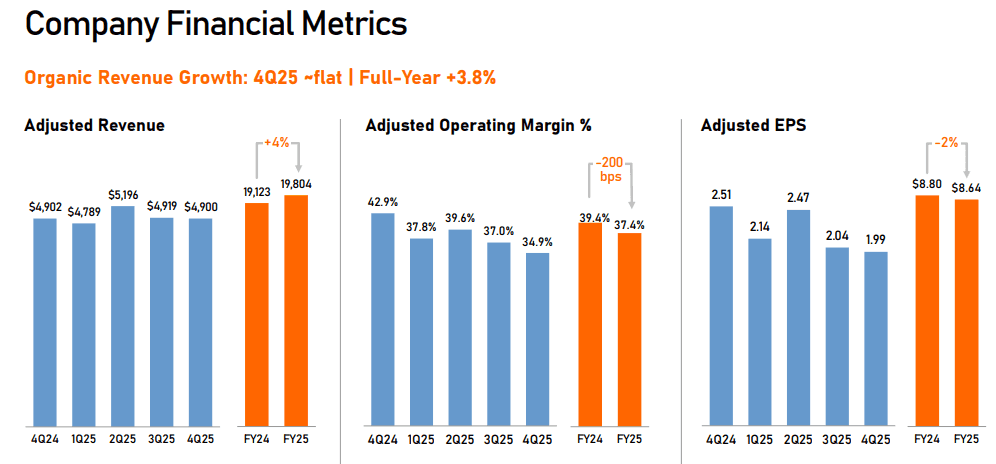 Profitability told a softer story. Adjusted EPS declined 21% to $1.99 in Q4 and fell 2% to $8.64 for the full year, highlighting margin pressure and slower operating leverage despite stable top-line performance.