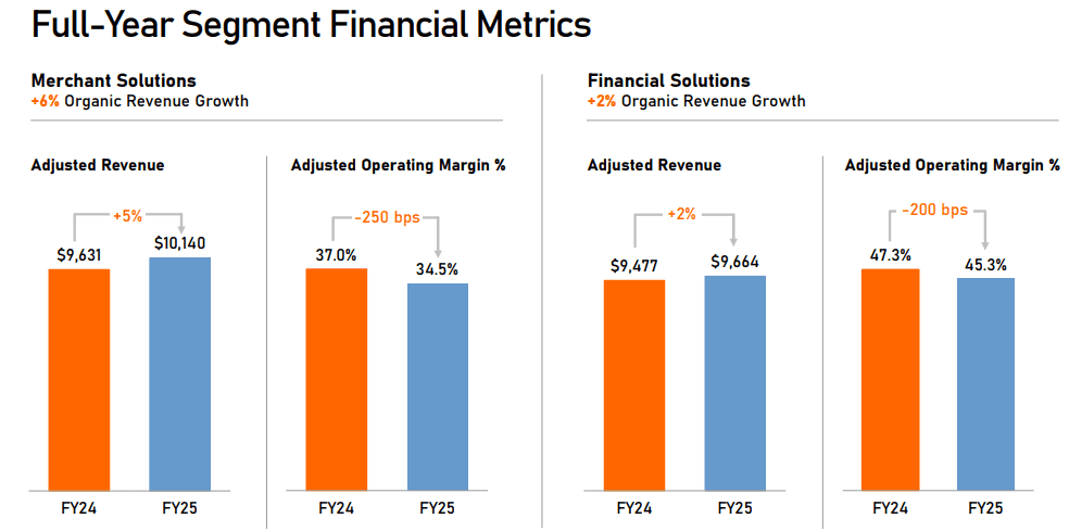 The margin erosion reflects slowing growth in both Merchant and Financial Solutions, combined with increased spending on technology upgrades and strategic restructuring initiatives.