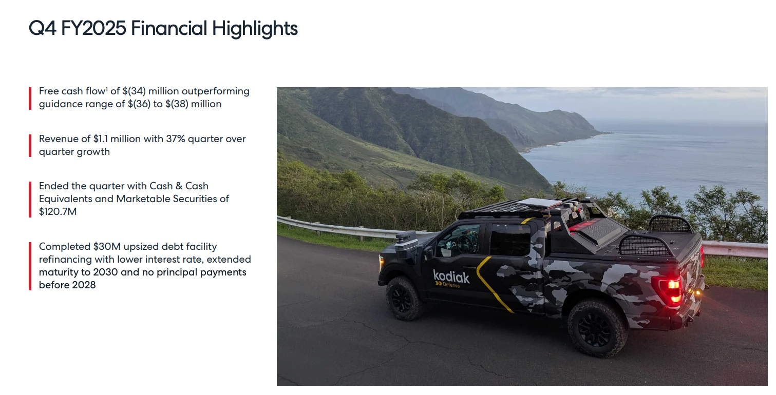 The company also highlighted advancements in its AI initiatives and defenserelated business, reinforcing the broader strategic positioning of Kodiak beyond just commercial trucking. However, these positives were partially offset by slightly higher projected free cash flow usage for 2026, indicating continued investment as the company scales.
