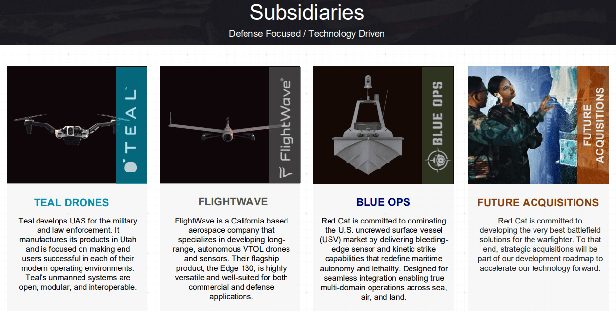 Description: Red Cat Holdings Inc is a drone technology company integrating robotic hardware and software for military, government, and commercial operations. Red Cat's suite of solutions includes the Arachnid family of ISR and precision strike drones, which includes the Black Widow, a small unmanned ISR system; and WEB (Warfighter Electronic Bridge) GCS, designed to command and control an entire drone family of systems for military operations. Its other offerings include Edge 130 Blue drone systems, Trichon, a fixed-wing VTOL for extended endurance and range, and FANG FPV drones optimized for military operations with precision strike capabilities.