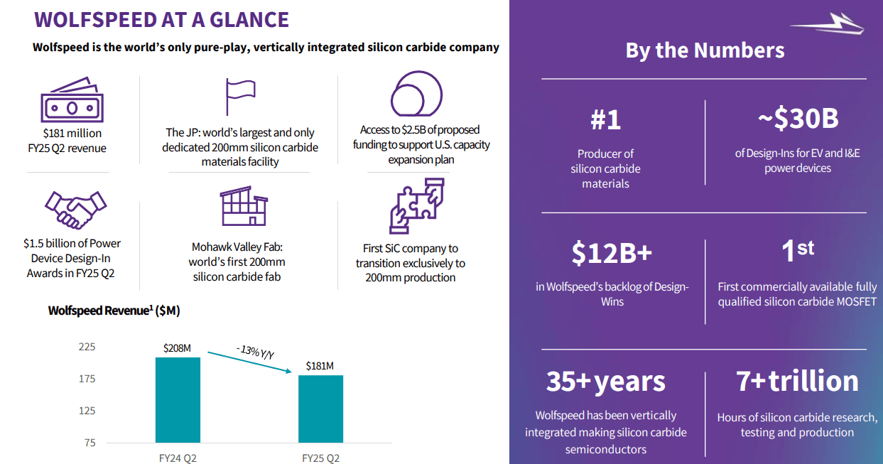 Wolfspeed, formerly known as Cree until its 2021 rebrand, is a long-time player in the silicon carbide (SiC) semiconductor market. The company fully controls its supply chain from raw materials to finished devices a strategic advantage that theoretically enhances U.S. semiconductor independence and aligns well with political priorities around reshoring and supply-chain security.