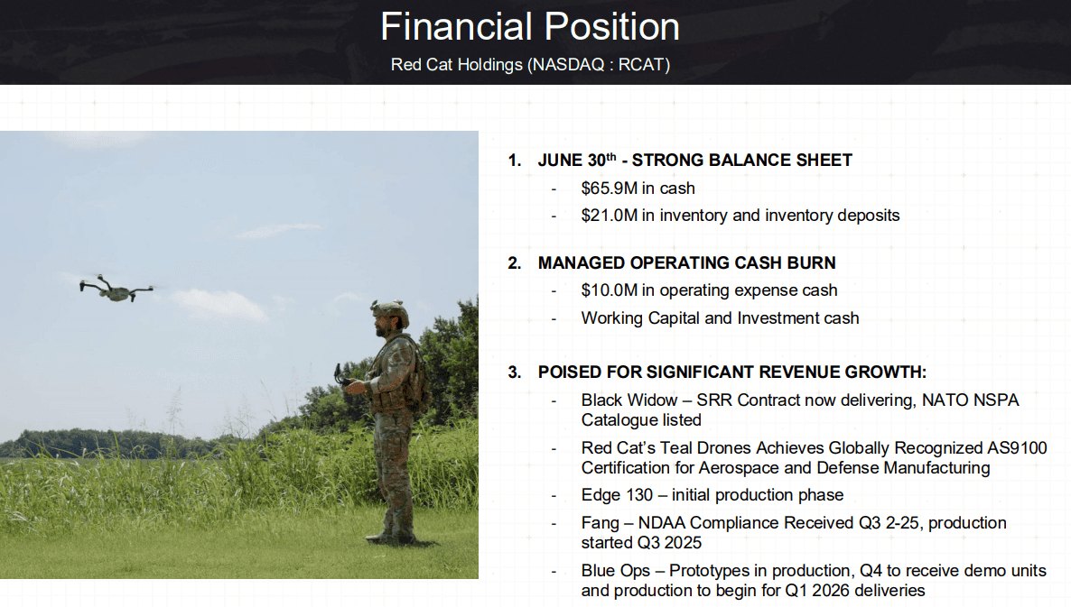 Red Cat Holdings currently operates with only two products Black Widow and Edge130 serving a narrow slice of the small unmanned aerial systems (sUAS) market. While recent contract wins have provided short-term momentum, the company’s lack of product and customer diversity exposes it to significant risk if market conditions or defense priorities shift. Most of Red Cat’s revenue is concentrated in military contracts and the U.S. Border Patrol, leaving the company vulnerable to disruptions or budgetary changes in these sectors.