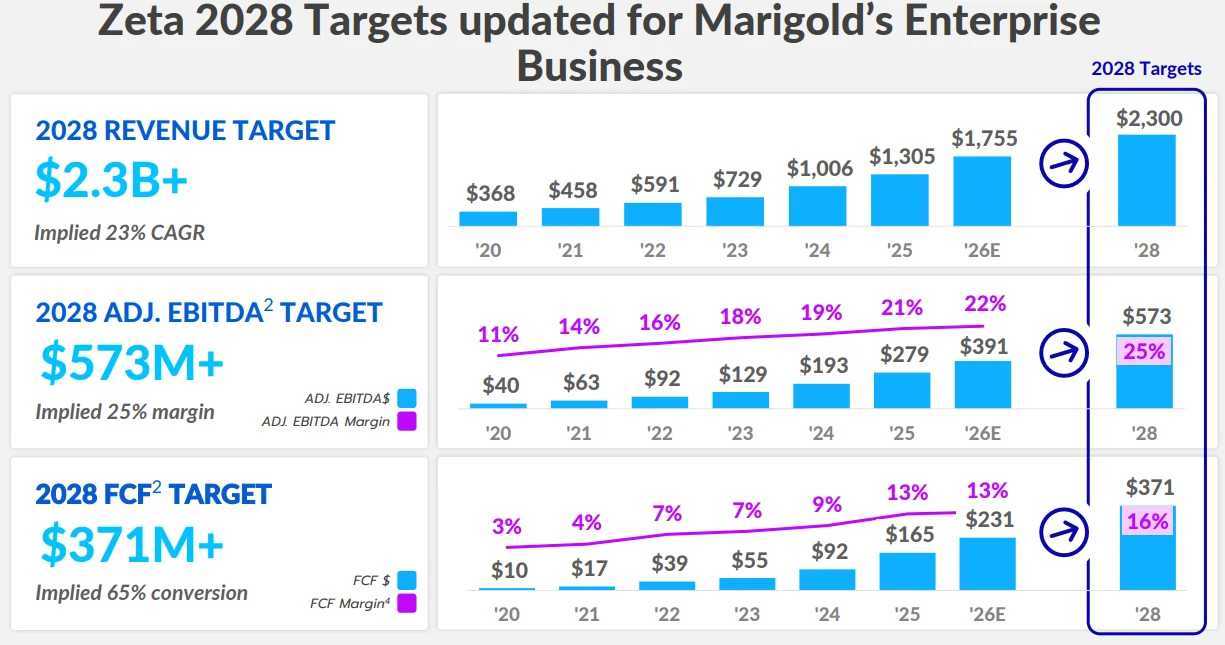 To achieve this, management aims to expand market share within its existing customer base by just 100 basis points. Scaled Customers collectively spent over $100 billion on marketing and advertising last year, while Zeta generated roughly $1 billion in revenue, representing only about 1% penetration. Simply increasing that share to 2% by 2028 primarily through deeper usage and expanded adoption would materially accelerate revenue growth without requiring dramatic customer acquisition expansion.