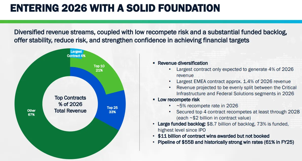 Bear Case: Financial expectations have moderated, reflected in a reduction of the FY26E target EBITDA multiple from 17.6x to 15.8x. The Federal Solutions segment is exposed to potential federal budget cuts and evolving government procurement practices, both of which could pressure future awards and backlog visibility. Additionally, ongoing challenges in hiring and retaining skilled labor, geopolitical tensions in the Middle East, and broader macroeconomic uncertainty create operational and execution risks that could weigh on performance.
