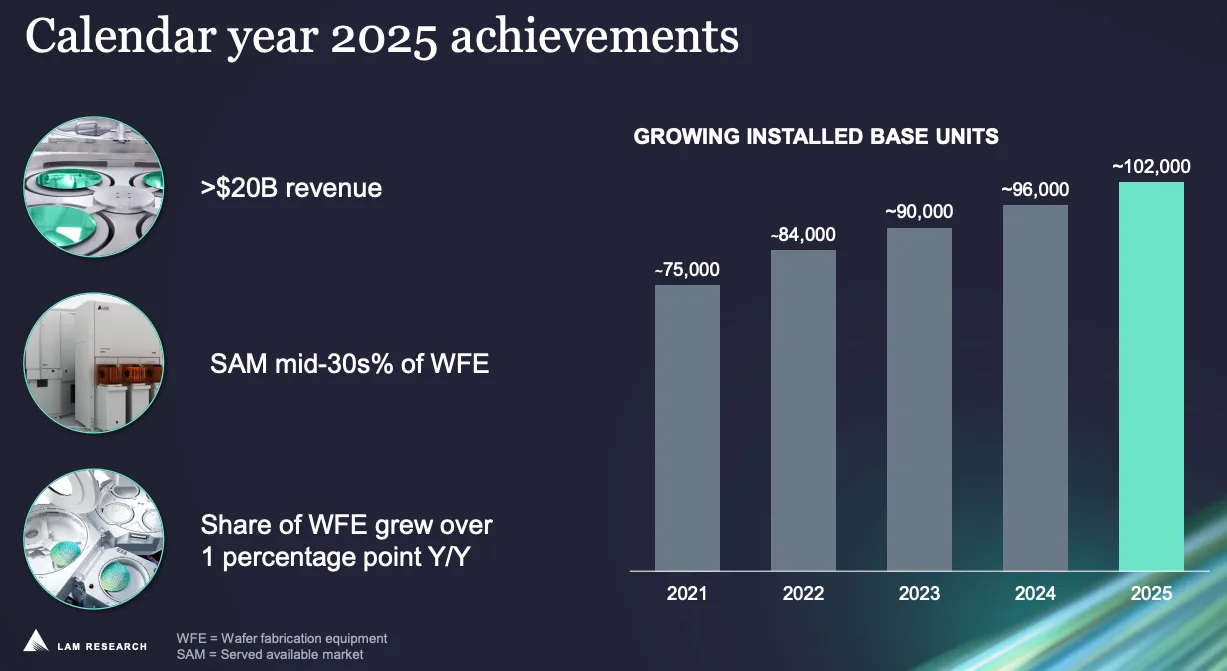 Looking forward, management is guiding for a 23% year-over-year expansion in the wafer fabrication equipment market to $135 billion by 2026. If that plays out, Lam is well positioned to capture a meaningful portion of that growth, especially given its exposure to both memory and logic customers.