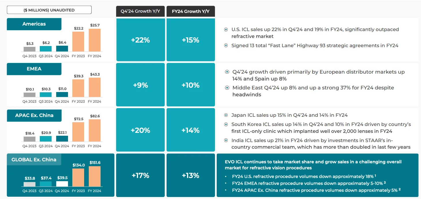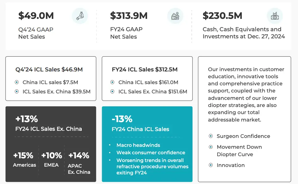 Implantable Collamer Lenses (ICLs) continue to dominate, accounting for nearly all of STAAR’s revenue. The EVO family including EVO ICL, EVO+ ICL, and EVO Visian ICL drives the majority of sales. Other older intraocular lenses (IOLs) for cataract surgery have been largely phased out, allowing the company to focus exclusively on its ICL refractive business.