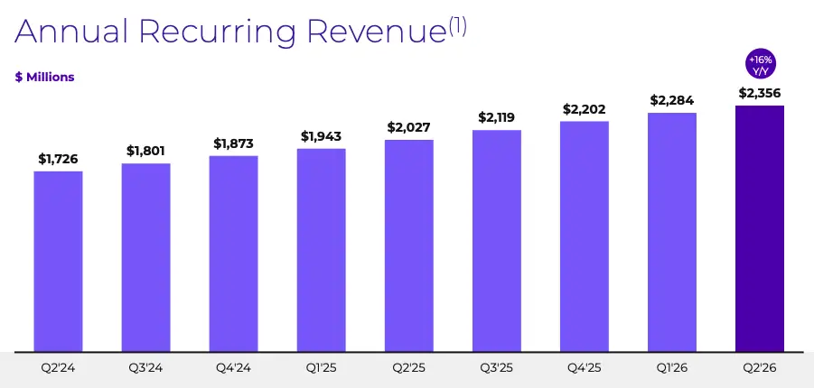 Nutanix tracks Annual Recurring Revenue, or ARR, as a key indicator of the health and growth of its subscription-based business model. ARR represents the total annualized value of all active subscription contracts at the end of a reporting period, and for Q2 FY2026, it reached $2.356 billion, marking a 16% increase year-over-year.