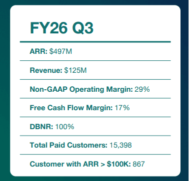 Annual Recurring Revenue (ARR) rose 3% year over year to $497 million, while large customers with ARR over $100K grew 5% to 867.
