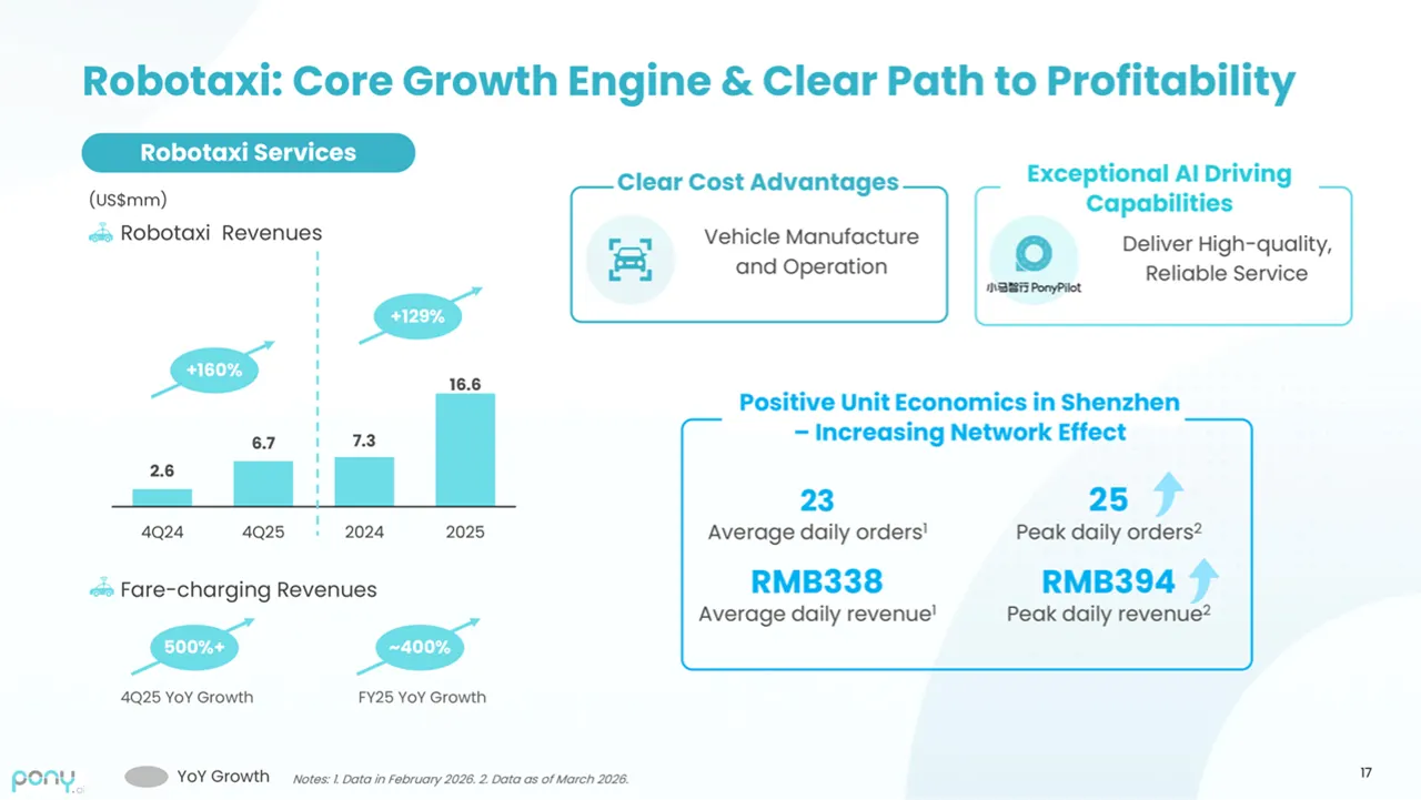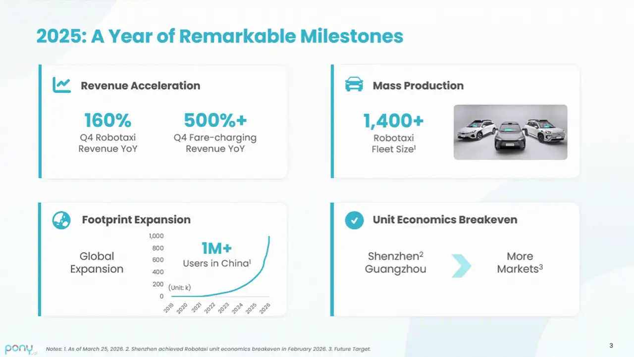 On profitability, Pony AI reported net income of $75.5 million in Q4, a significant turnaround from a net loss of $181.1 million in the same period last year.