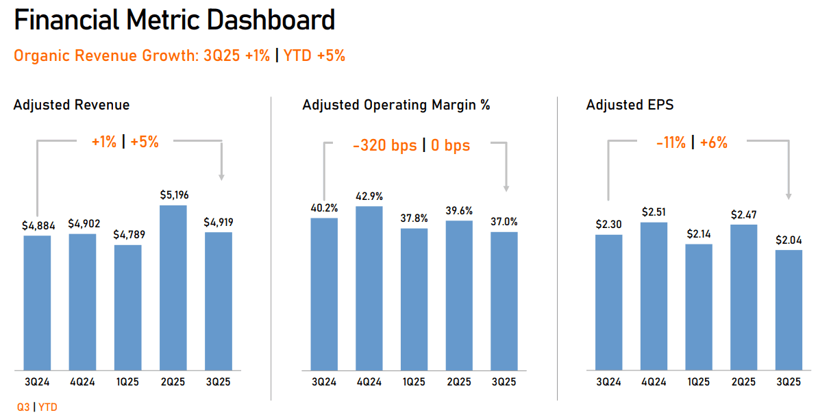Management responded by sharply cutting full-year 2025 guidance. Organic revenue growth is now seen at just 3.5%–4%, down from a prior 10% target, while adjusted EPS is projected at $8.50–$8.60 versus $10.15–$10.30 previously.