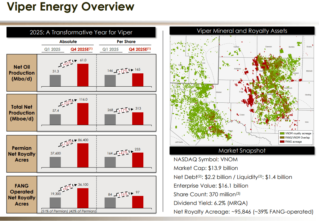 In Q3 2025, Viper beat expectations with adjusted EPS of $0.40 and revenue of $418 million, nearly doubling year over year due to acquisition-driven production growth. A GAAP net loss was driven by a one-time non-cash impairment.