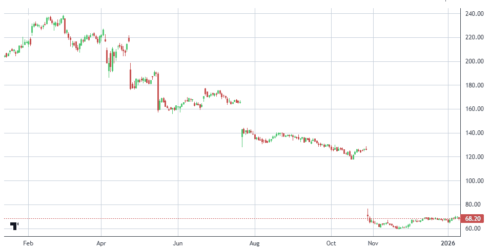 The selloff accelerated after Q3 2025 results, when shares plunged roughly 42% in the company’s worst single-day decline ever.