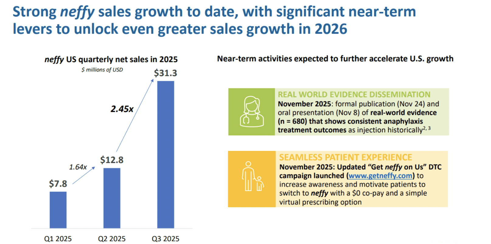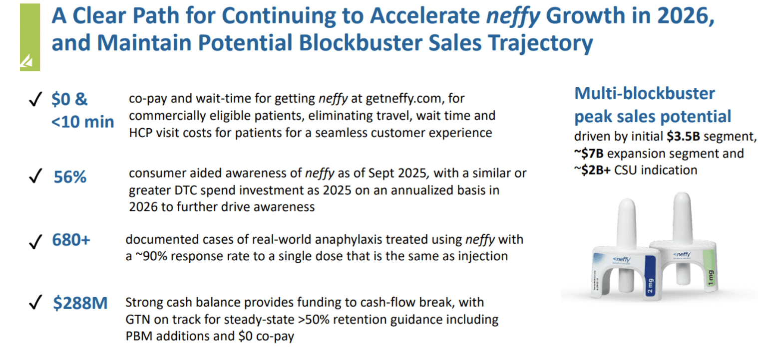 Needle hesitation remains a major friction point. A needle-free alternative like Neffy has the potential to expand both prescribing behavior and adherence. If Neffy were to meaningfully penetrate the U.S. EpiPen market at roughly $199 per dose, the opportunity could approach $600 million annually, excluding incremental demand from first responders, schools, and clinical inventory.