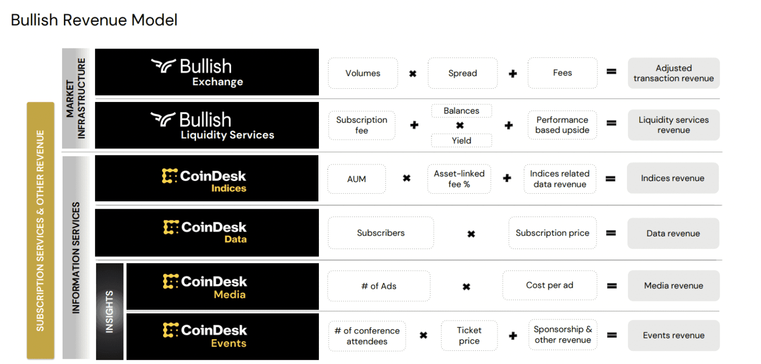 Bullish is an institutionally-focused digital asset platform with a dual business model: a regulated global exchange (Market Infrastructure) and a data/media/events arm.