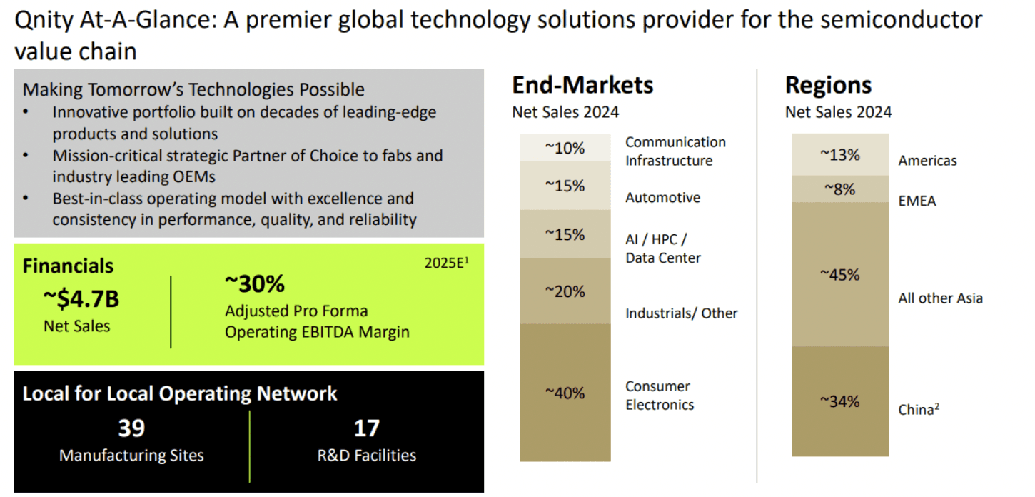 Description: Qnity is a specialty chemicals company created in 2025 after being spun off from DuPont. It sells chemicals and materials to the semiconductor industry, which generates the majority of sales, and also the electronics industry.